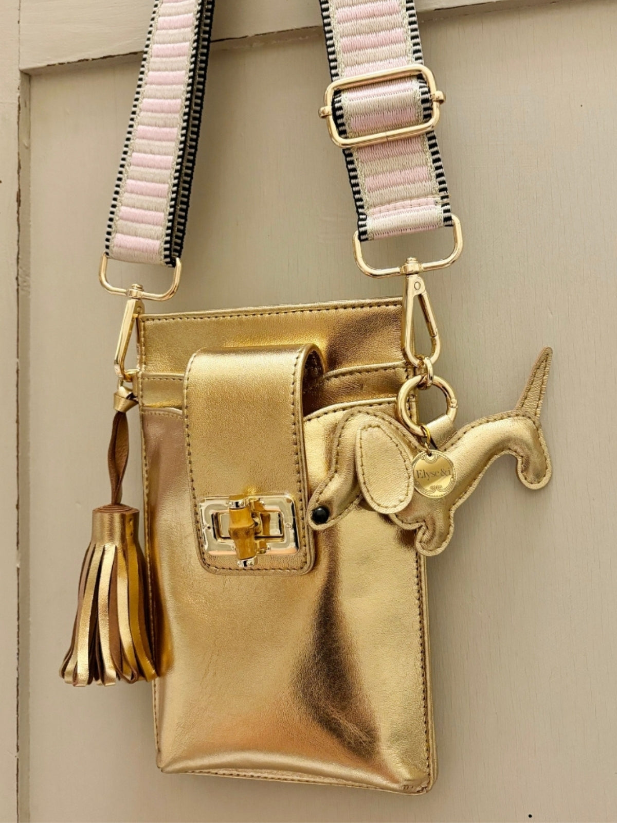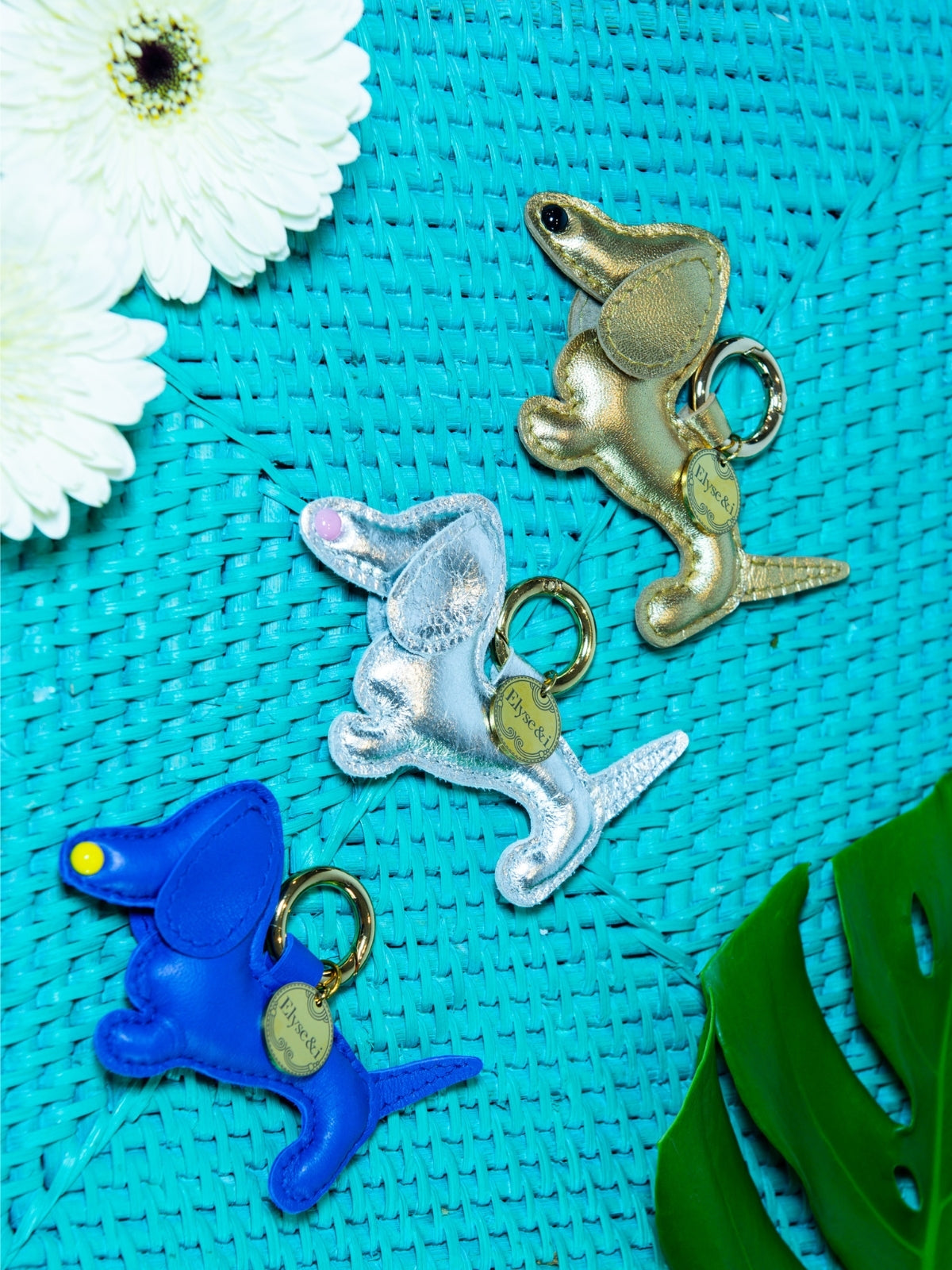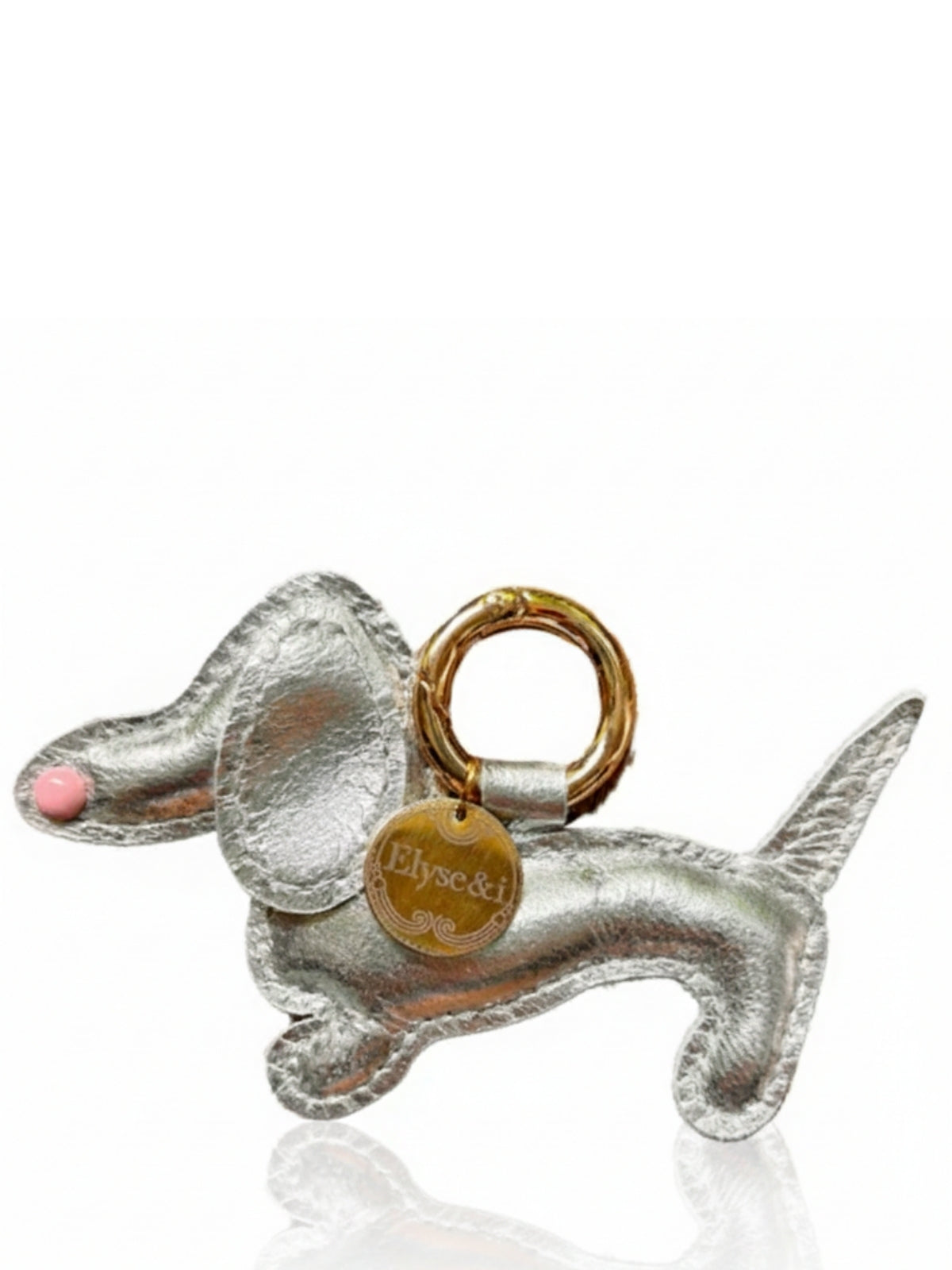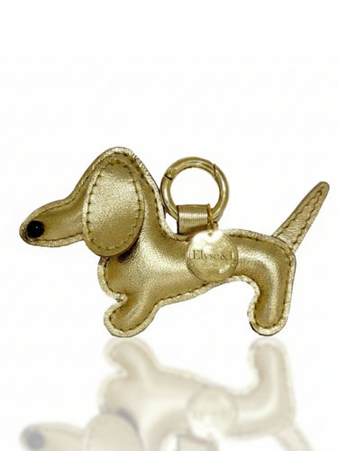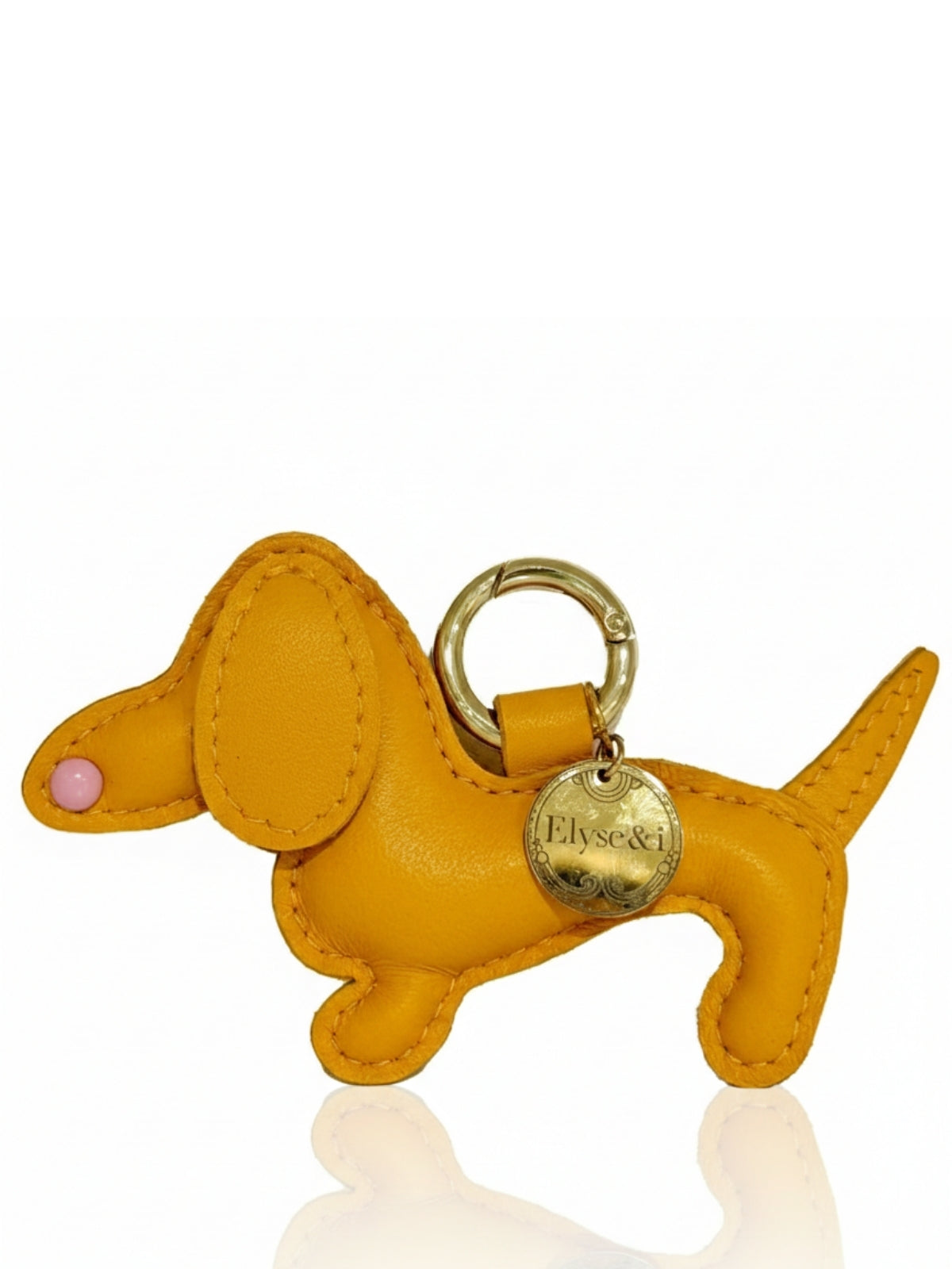 Our dachshund dog bag charm is a joy for everyone, not just dog lovers! Use as a bag charm or keyring. It comes with a gold toned jump ring (push to open) so you can easily attach to a bag or keys.  The dog is expertly handcrafted in indigo blue, orange, canary yellow, gold and silver leather (we use our leftover leathers from our bag production - reducing waste!) and has the cutest flappy ears and a coloured enamel nose.
