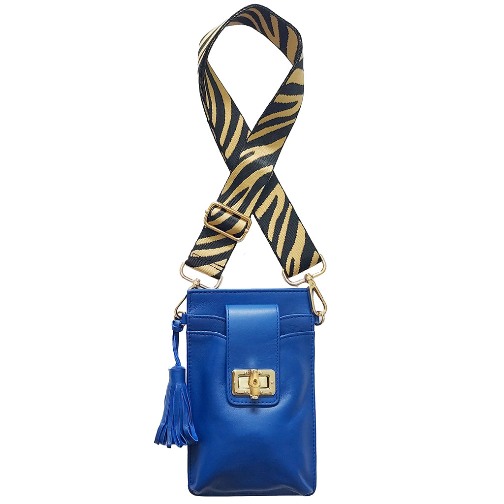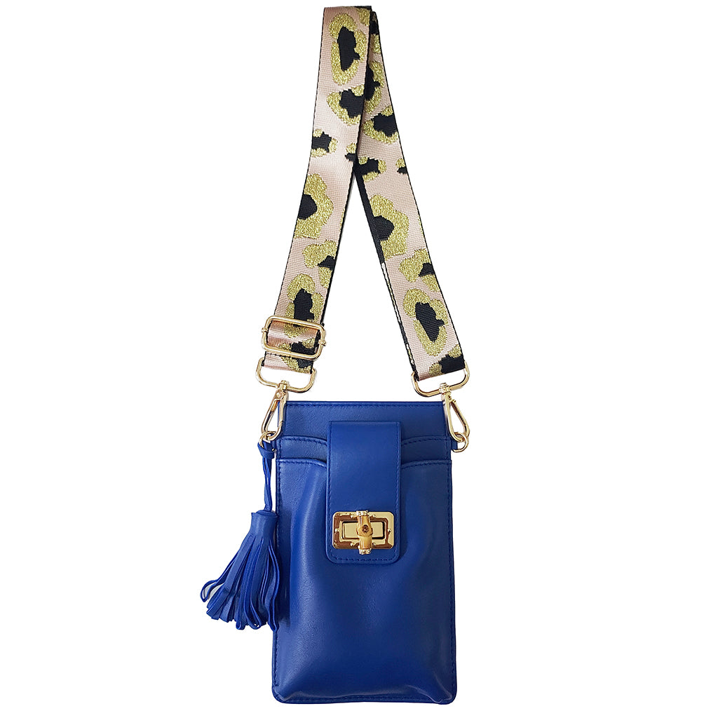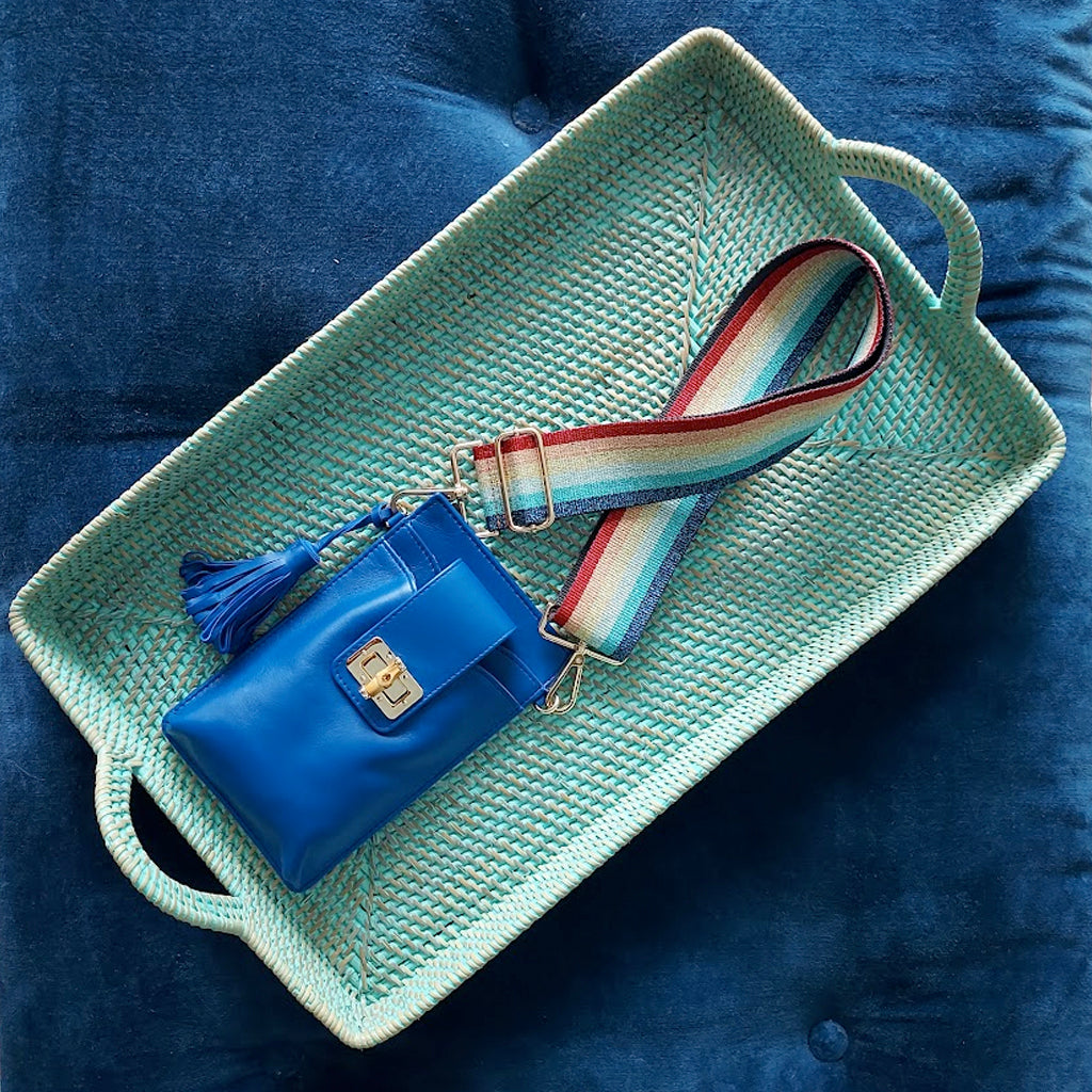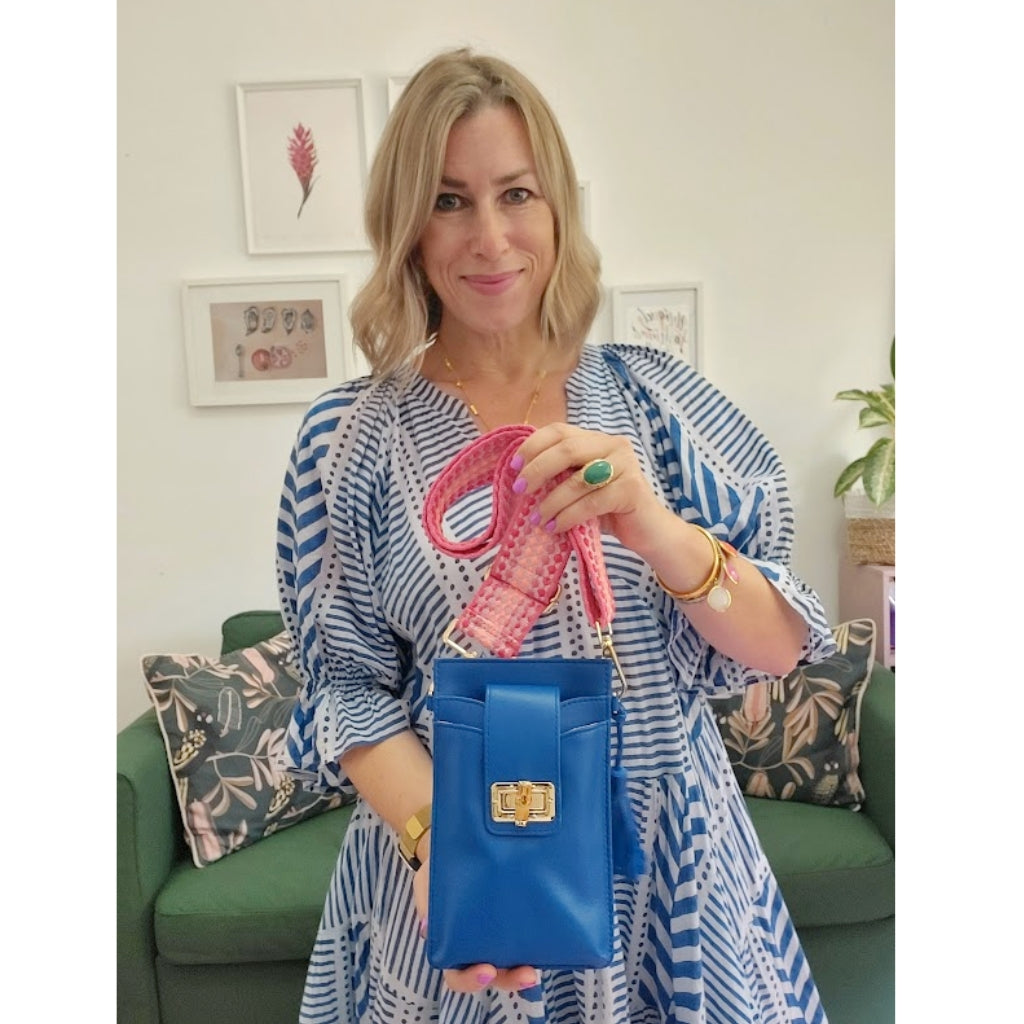 The Luna Lock in bright, bold, indigo blue leather. Whilst it is bijoux in size, you’ll find a double compartment on the front of the bag for your phone & other essentials and card slots on the back. There is a looped tassel adornment and secure fastening with the bamboo turn lock.