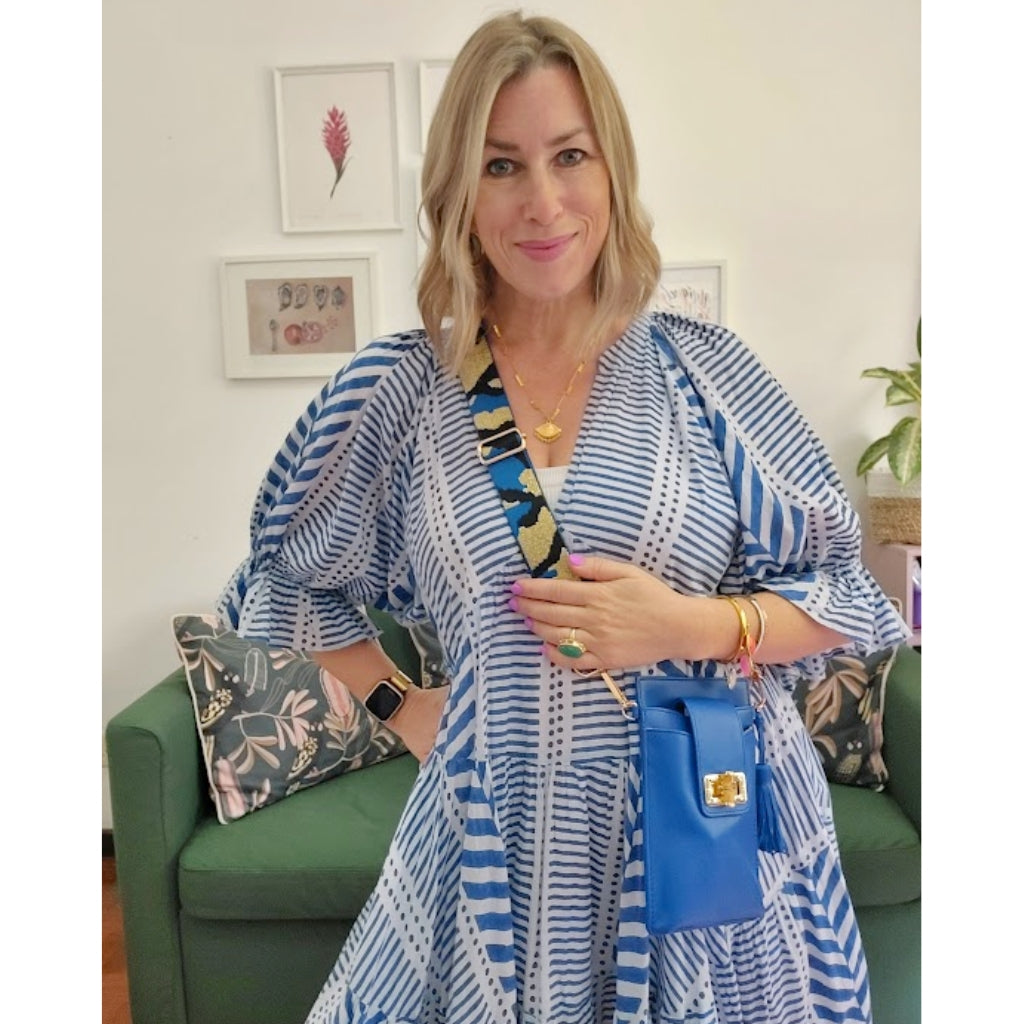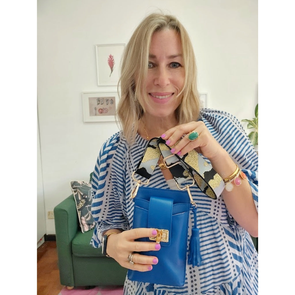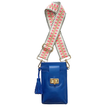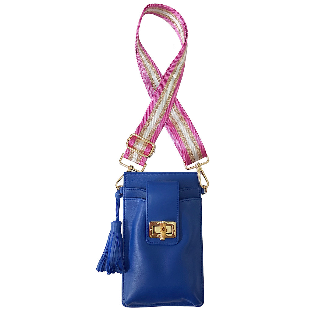 The Luna Lock in bright, bold, indigo blue leather. Whilst it is bijoux in size, you’ll find a double compartment on the front of the bag for your phone & other essentials and card slots on the back. There is a looped tassel adornment and secure fastening with the bamboo turn lock.