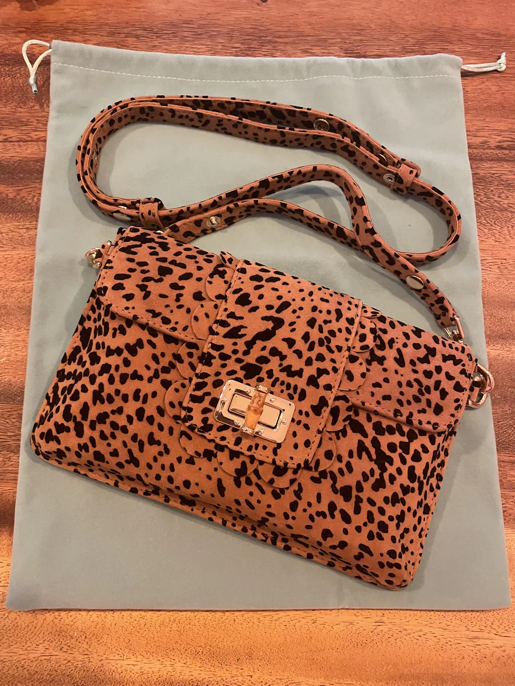 The Finn Scallop is a compact yet surprisingly roomy bag, designed with a softly structured silhouette and scallop-trim edges. Seen here in cheetah-print lamb suede, it’s finished with our signature bamboo turn-lock.