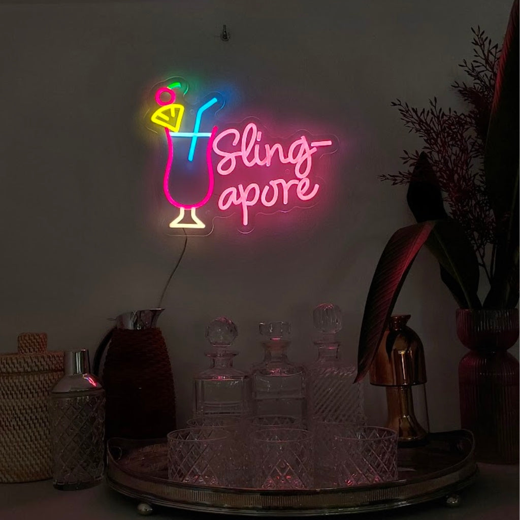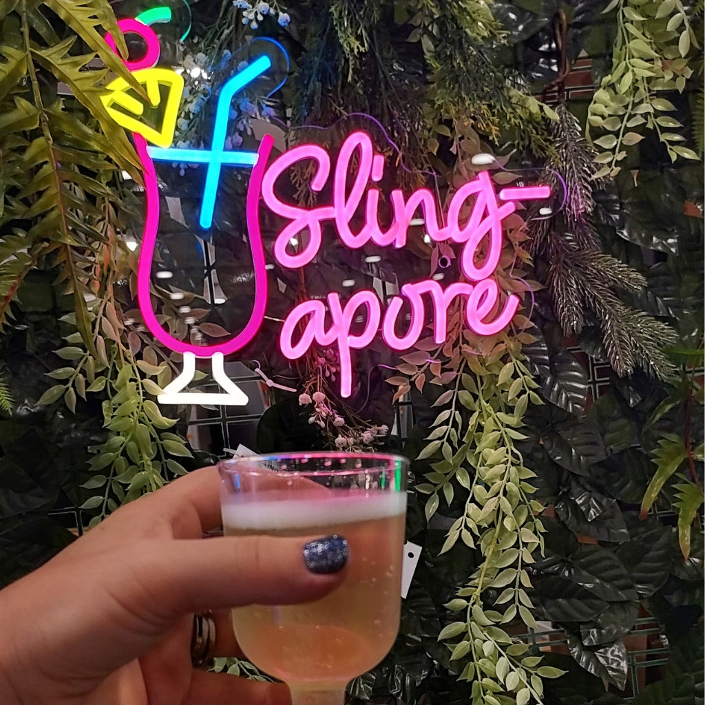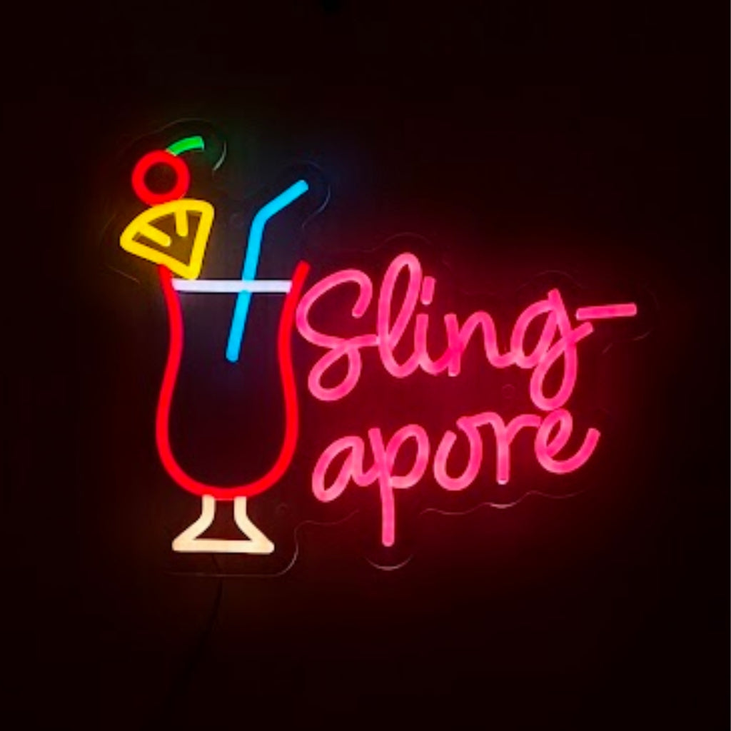 PRE-ORDER BESPOKE ITEM.  Who doesn't think of a Singapore Sling when thinking of Singapore? This sign is a fun play on words and will illuminate a bar area, balcony or a nook at home.