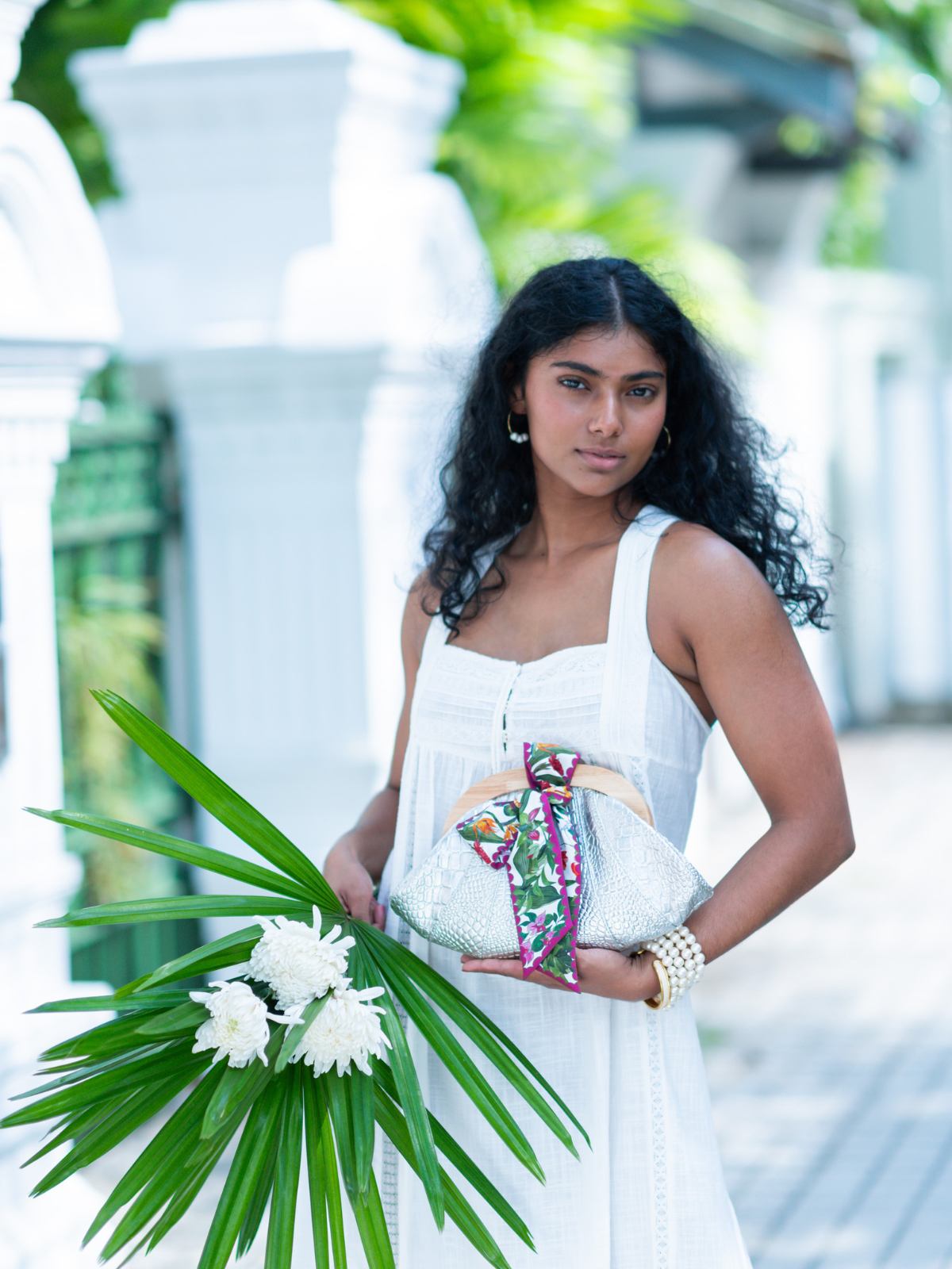 The Dawn Scallop in silver croco-embossed goatskin is a striking take on our heritage scallop design. With one side detailed in scallops and the other ready for a bow-tied twilly scarf, it offers multiple looks in one bag.