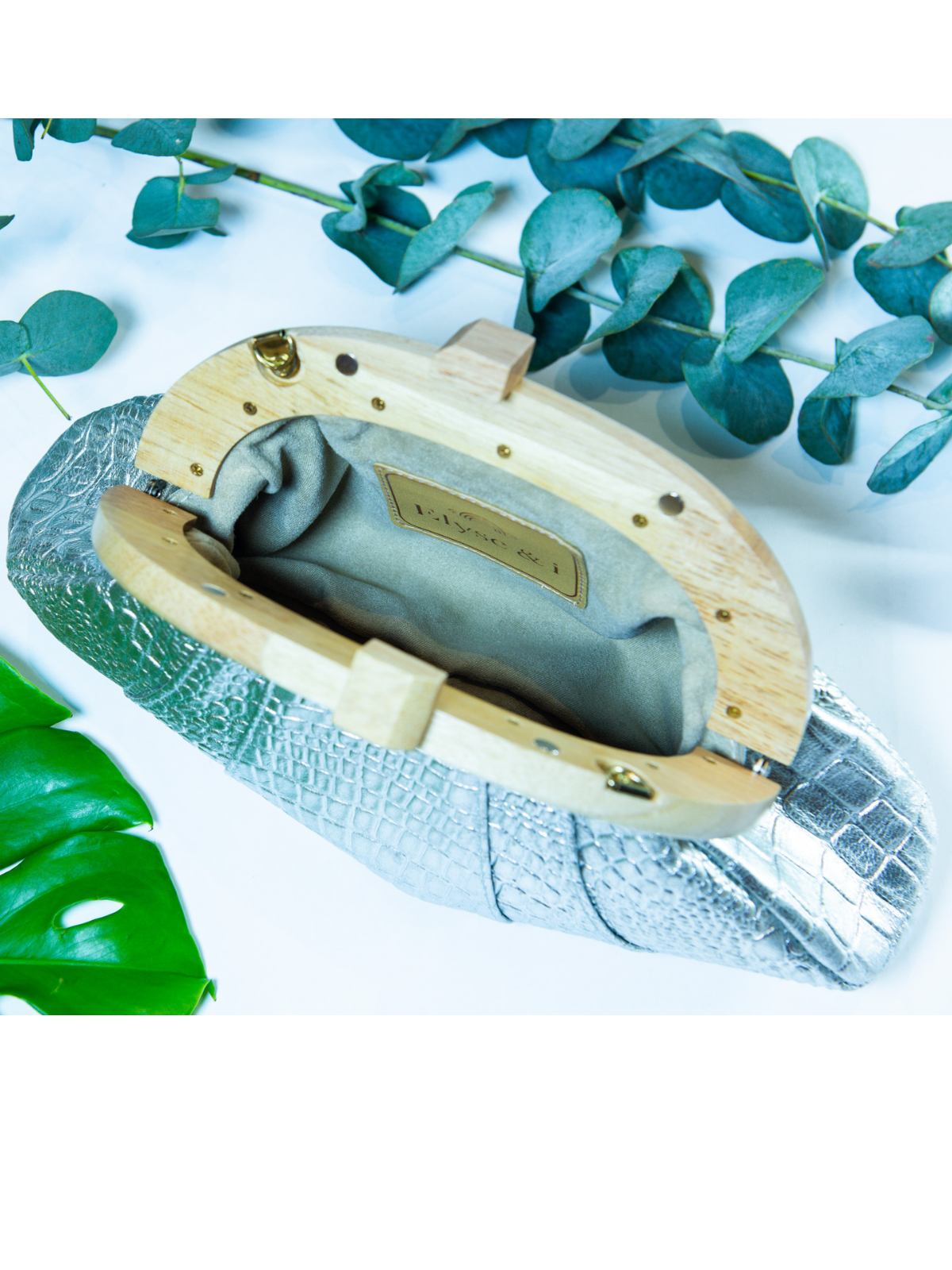Features: Scallop detailing on one side, scarf loop on reverse, magnetic wooden kiss-lock closure, adjustable leather strap from 70 cm to 120 cm, gold-tone hardware