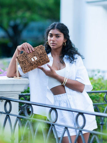 The Finn Scallop is a compact yet surprisingly roomy bag, designed with a softly structured silhouette and scallop-trim edges. Seen here in cheetah-print lamb suede, it’s finished with our signature bamboo turn-lock.
