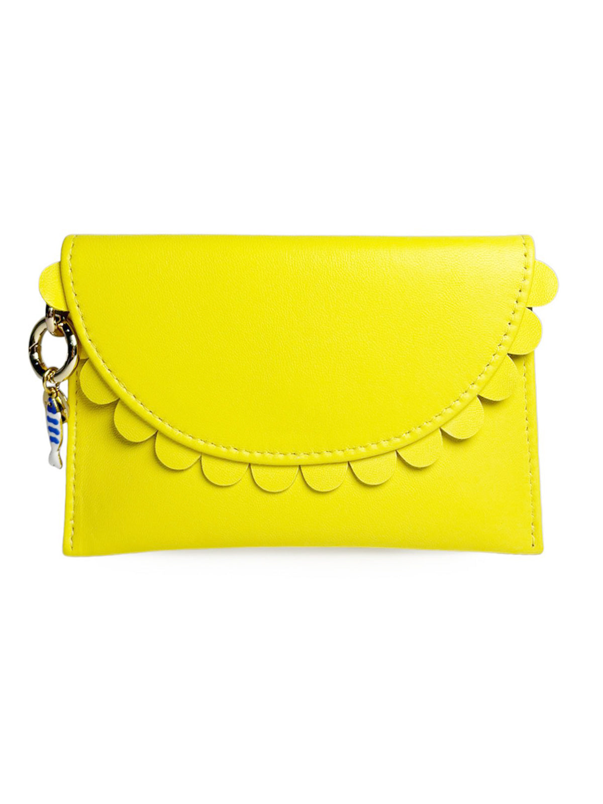 The Bella purse is a playful and practical addition to your handbag - seen here in hair on canary yellow lambskin. With it's scallop edge detail, secure popper closure and back pocket, there's plenty to love about this purse. It now comes with an adorable bejewelled charm such as a fish, shell, bow or croissant. Please specify charm choice from drop down menu and in notes.