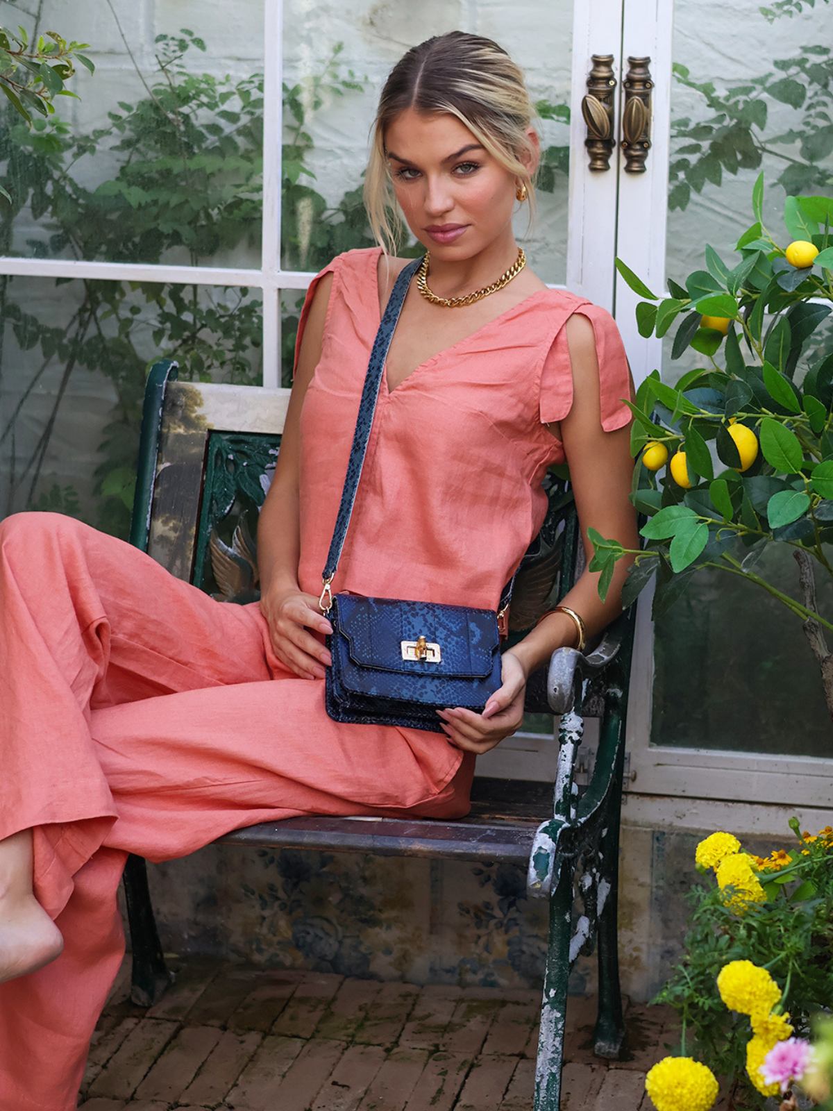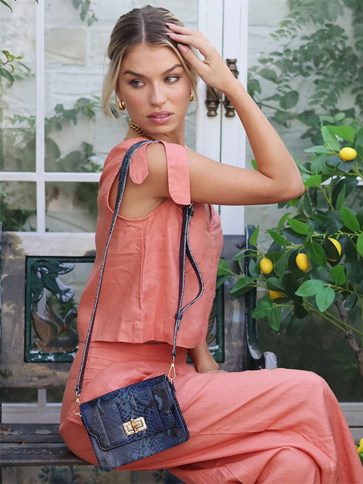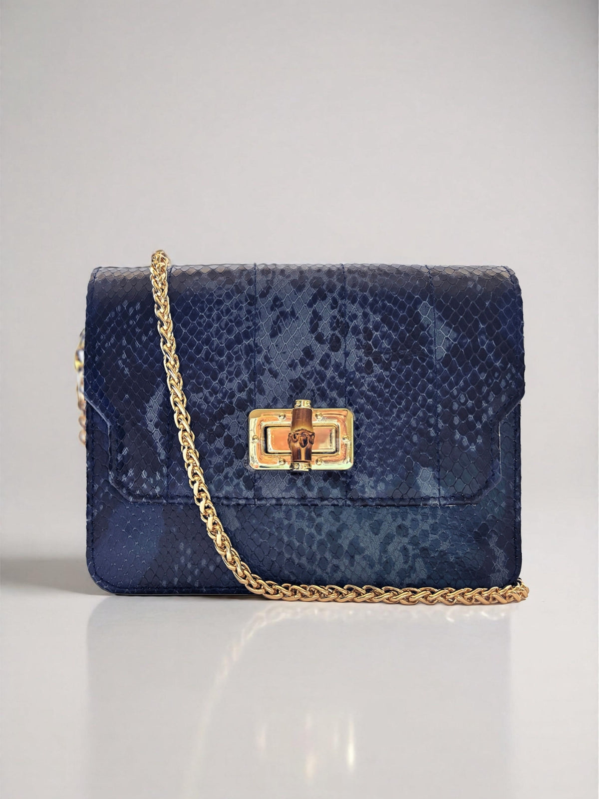 A darling mini structured bag in an elegant accordion shape, elevated with quilted leather and our standout bamboo turn-lock closure. Compact yet refined, it has just enough space for your essentials — phone, cardholder, and keys. Crafted in embossed calf leather with a rich navy python print, it’s a bag that makes a subtle statement.