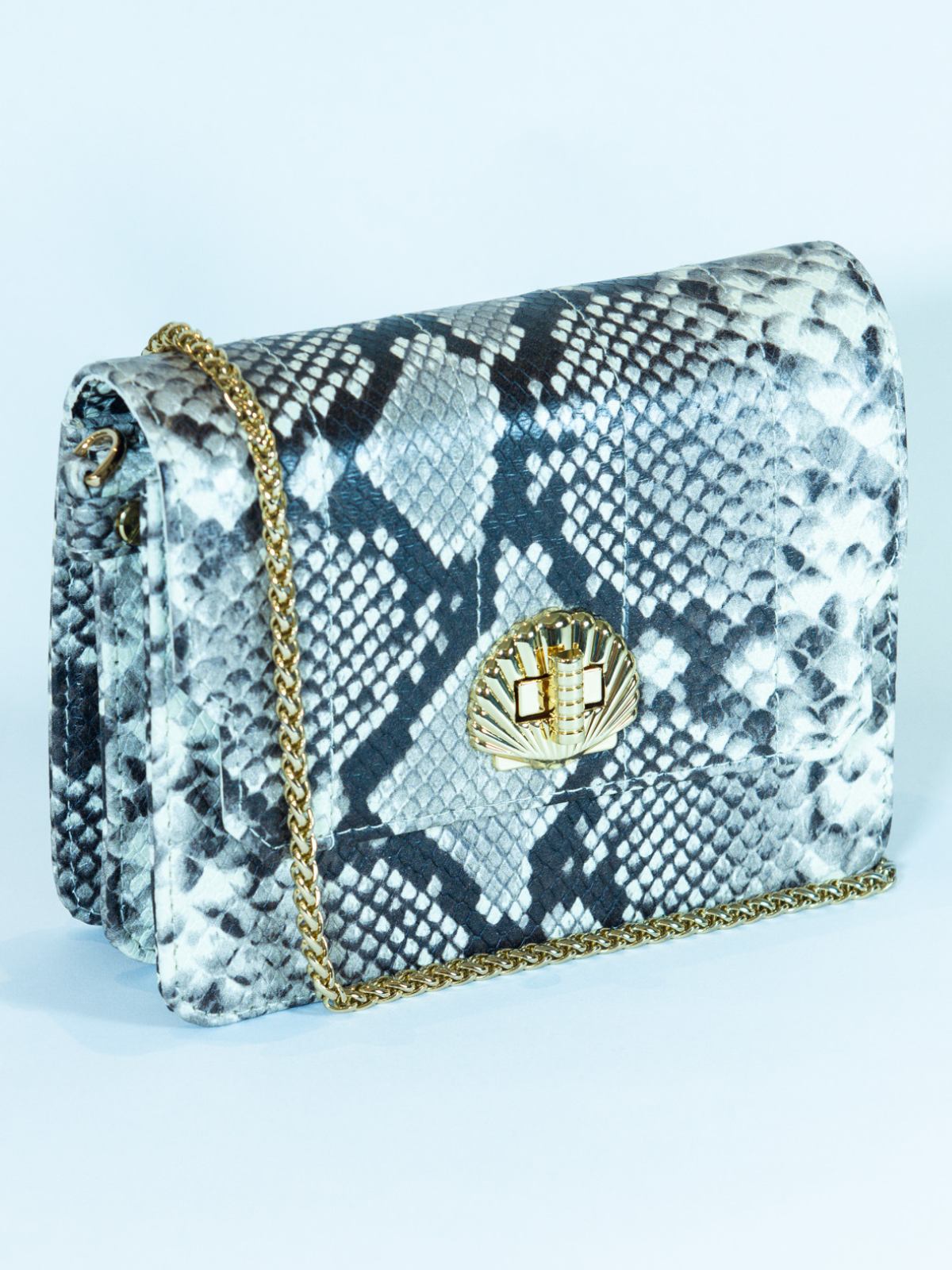 The Otis is a petite structured accordion bag with quilted leather detailing and our signature shell turn-lock closure. Designed to hold your daily essentials — phone, cardholder, and keys — it’s compact, versatile, and endlessly chic. Shown here in monochrome snakeprint embossed goatskin leather, it’s a striking neutral that pairs effortlessly with almost everything.