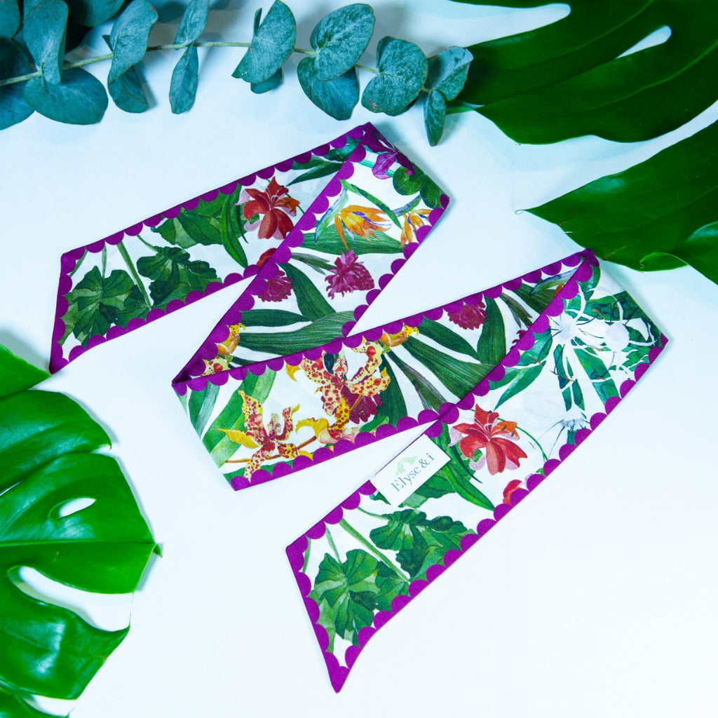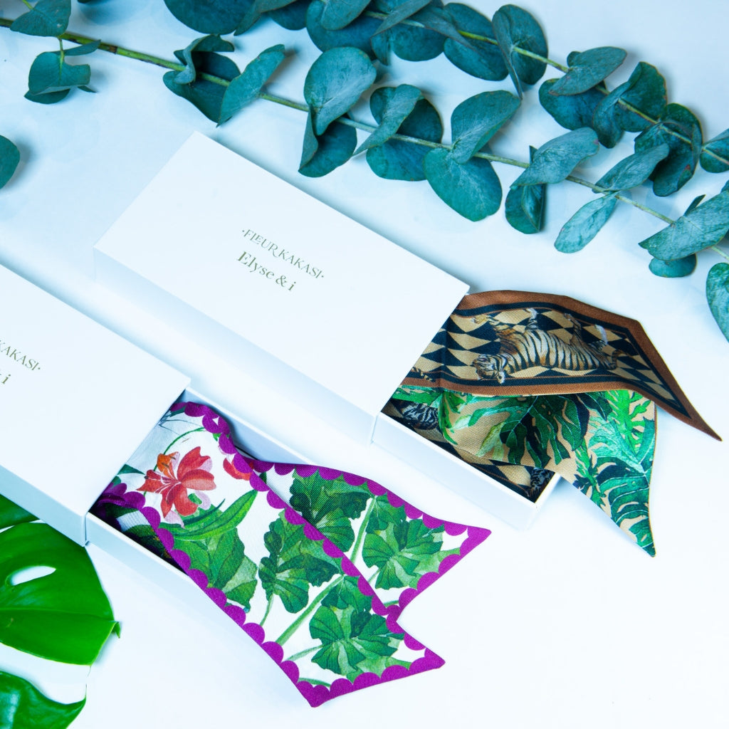 This special collaboration brings together a shared love for creativity and craftsmanship. Renowned artist Fleur Kakasi begins each design by hand in watercolor, layering botanical elements and rich colors before digitally refining them into stunning compositions. Her signature style—saturated hues, intricate details, and hidden ‘Easter eggs’ waiting to be discovered—comes to life in these exclusive silk scarves.