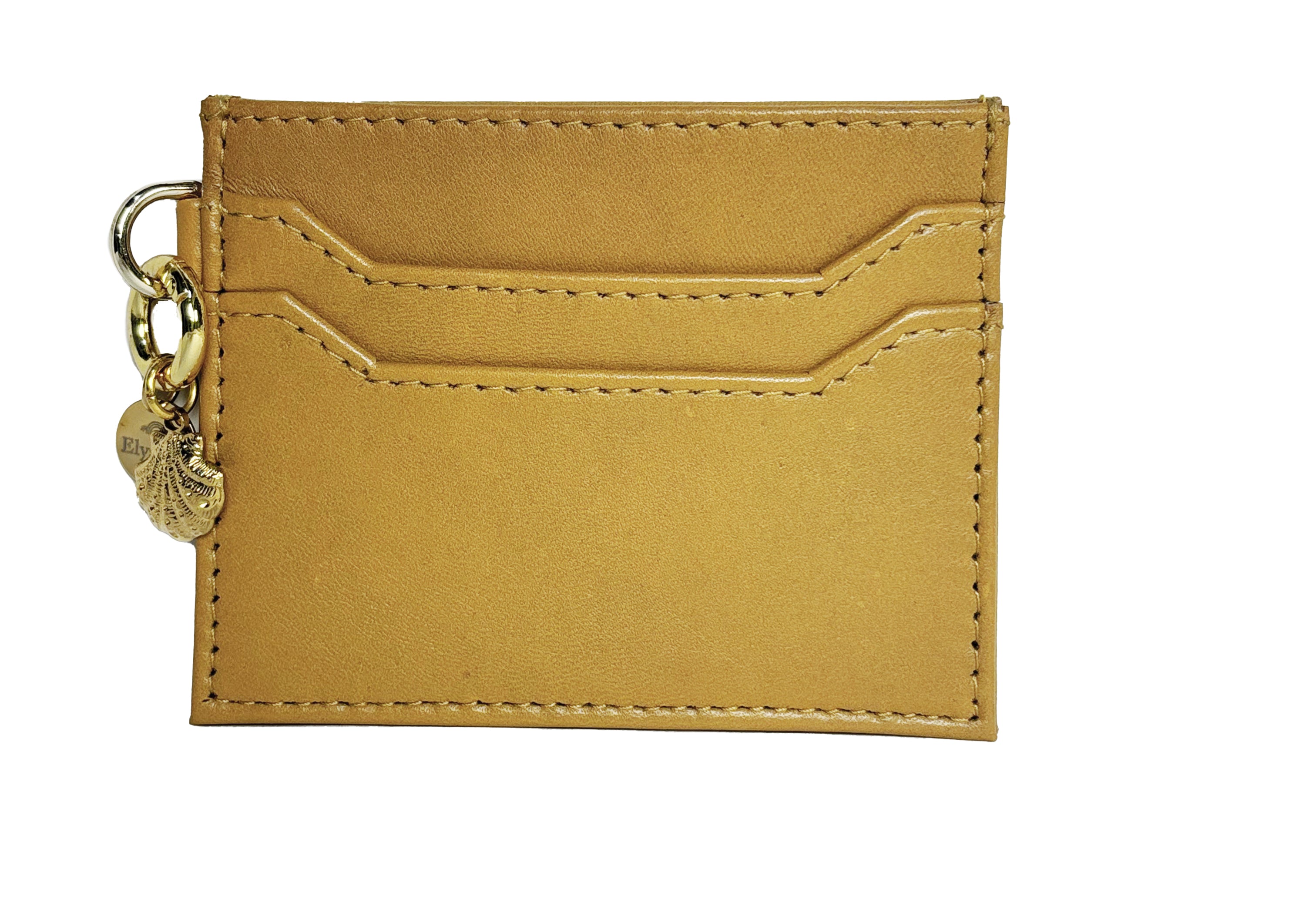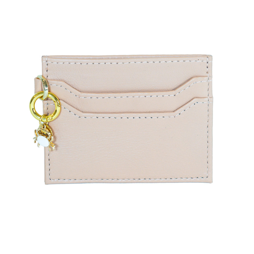 Faux suede lining, two outside card slots, one inside cavity, gold tone hardware including d-ring, removable charms.